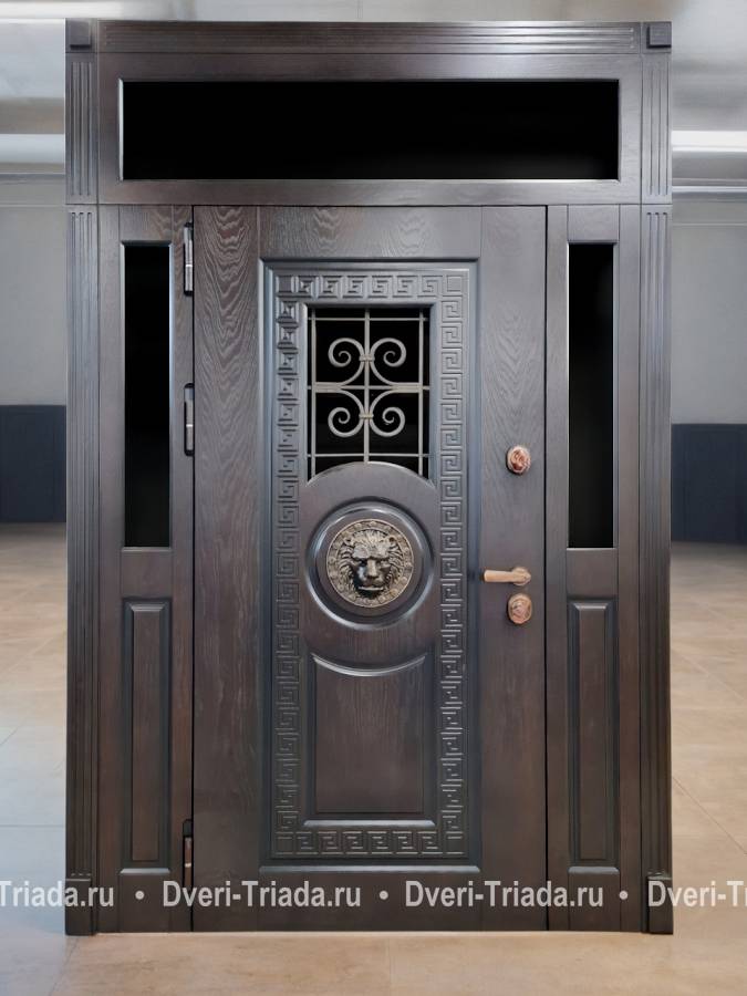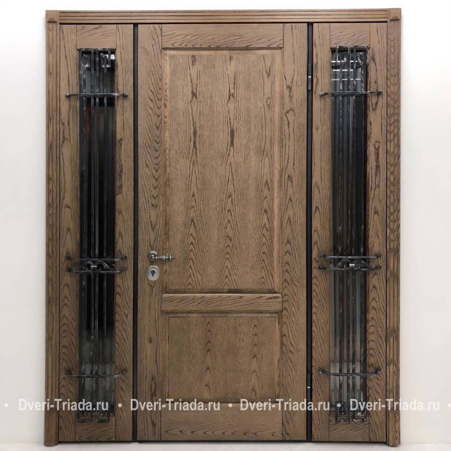 Остекленная полуторная термодверь с кованой решеткой (отделка панелями МДФ с фрезеровкой) Арт-639